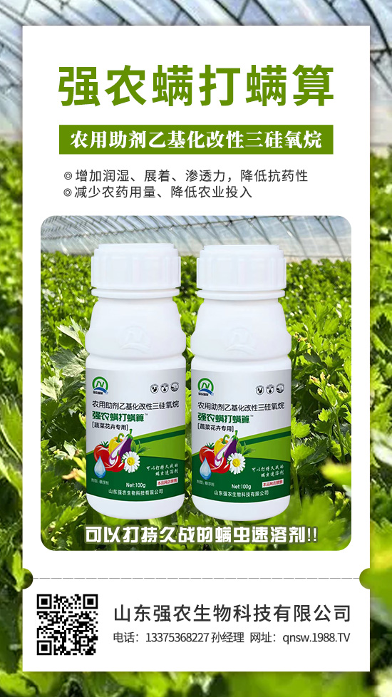 強(qiáng)農(nóng)螨打螨算是山東強(qiáng)農(nóng)生物科技有限公司與華中農(nóng)業(yè)大學(xué)有機(jī)溶劑研究院經(jīng)過多年努力螯合萃取而得的新型溶解劑。又通過高新納米技術(shù)添加了高滲透溶解液,使本品對(duì)以柑橘、瓜果蔬菜為主的各種紅蜘蛛、二斑葉螨、茶黃螨等螨類成蟲及蟲卵噴施后快速穿透害蟲表皮蠟質(zhì)層、油脂層和磷脂層使其快速脫水干枯而死,使用本品藥效。