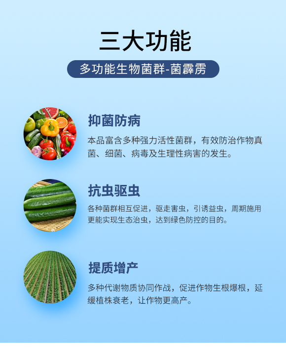 本品富含多種強力活性菌群,其新陳代謝的二次分泌物質(zhì)和活性酶物質(zhì)能大大抑制有害菌,搶占有害菌群生存環(huán)境,降低作物病害發(fā)生,有效防治作物真菌、細菌、病毒及生理性病害的發(fā)生。