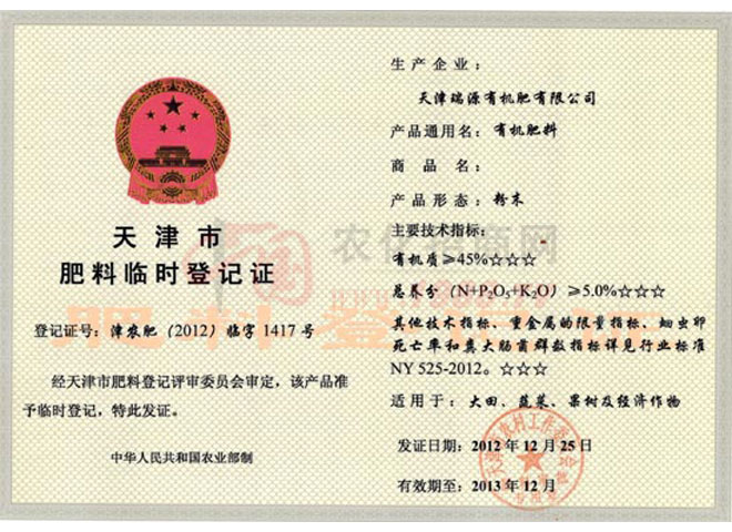 本公司通過技術(shù)研發(fā)和對(duì)多種農(nóng)作物進(jìn)行實(shí)踐,開發(fā)出了瑞遠(yuǎn)牌有機(jī)肥料,上市前經(jīng)過為期18個(gè)月,涉及京津、河北省保定、邯鄲、定州、山東省壽光、陜西省渭南等地區(qū),試用農(nóng)戶達(dá)200多戶,全部達(dá)到增產(chǎn)增收,減少病蟲害的試驗(yàn)?zāi)康。瑞源有機(jī)肥為有機(jī)食品、綠色食品、無(wú)公害食品生產(chǎn)提供優(yōu)質(zhì)高效及多種農(nóng)作物所需藥的營(yíng)養(yǎng)元素,為我國(guó)農(nóng)業(yè)加快有機(jī)肥料的快速可持續(xù)發(fā)展及促進(jìn)農(nóng)業(yè)生態(tài)良性循環(huán)和有機(jī)肥料的推廣起到一定作用。